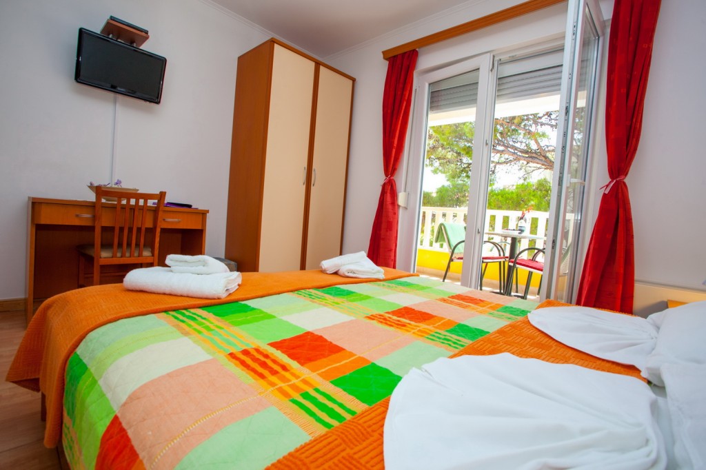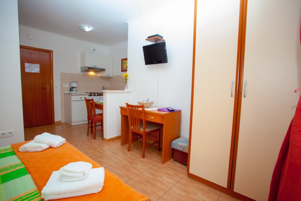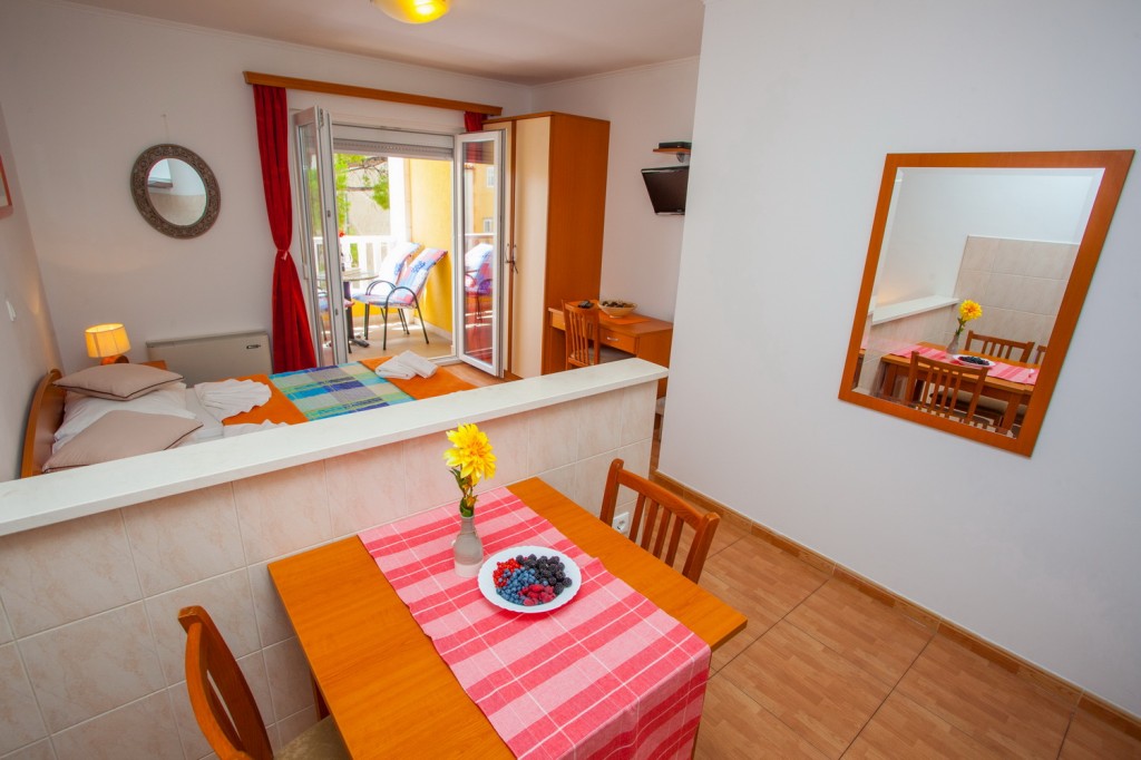 Studioapartman broj 7 se nalazi na drugom katu objekta. Sastoji se od jedne prostorije sa mini kuhinjom,sto,stolice i dupli lezaj za dvije osobe+WC sa dusem i balkon okrenut sa bocne strane objekta. Stusio je opremljen sa klima uredjajem,TV i pristupom internetu. Ciscenje i mjenjanje posteljine subotom,mjenjanje...