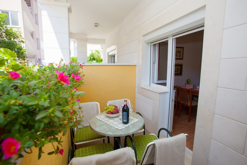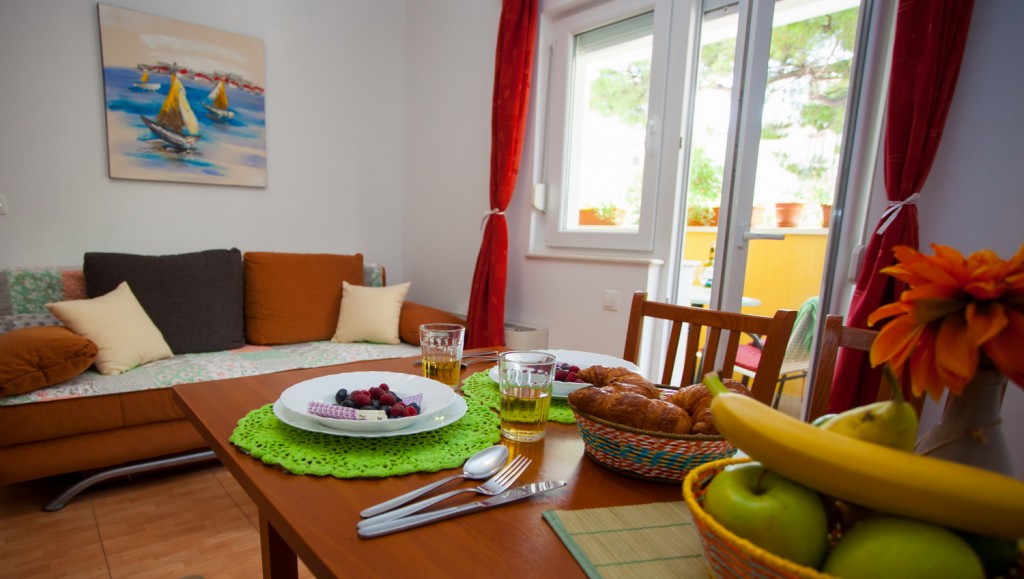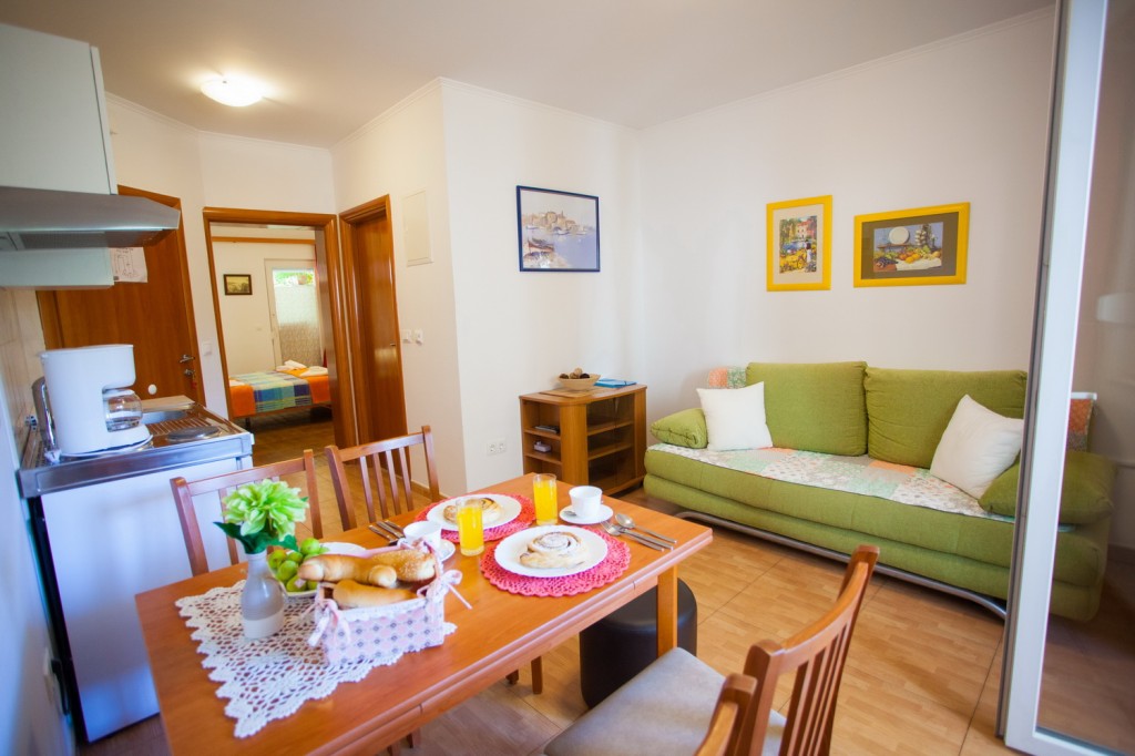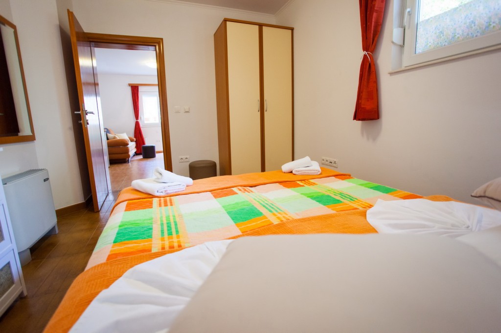 Apartman broj 1 nalazi se u prizemlju objekta i sastoji se od dvije prostorije, WC-a s tušem te balkona okrenutog prema prednjoj strani. Jedna od prostorija je spavaća soba s bračnim krevetom, a druga je kombinirani dnevni boravak s mini kuhinjom, stolom, stolicama i kaučem koji se izvlači za jednu odraslu...